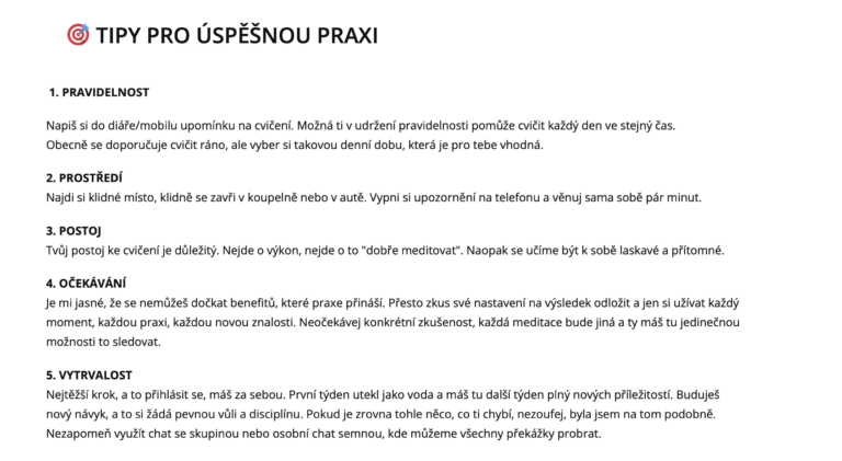 Dostanete přístup do členské sekce, ve které jsou formou videí a textů velmi srozumitelně vysvětleny jednotlivé kroky. Čeká nás společný měsíc, ve kterém si sami naplánujete, kdy se lekcím budete věnovat a kdy trénovat.