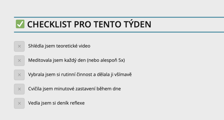 - Praktické cvičeníJedině praxe dělá mistra, proto ke každému týdnu bude seznam cvičení, které vám pomohou rozvíjet schopnost všímat si. Je důležité s praxí počítat a vyhradit si každý den 10 minut času.
