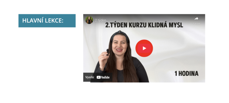 - Úvodní video (audio + text)V pondělí se ti otevře nová sekce kurzu. Obsahem je video (většinou hodinové) s teoretickým základem k danému týdnu, ve kterém si vše vysvětlíme do detailu.